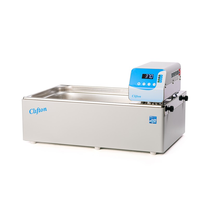 Clifton from Nickel Electro Stirred water baths feature a digital PID temperature controller and are designed for immersion of flasks, bottles, and racks in an accurate temperature environment throughout the water bath. The stainless steel tank is housed in a sturdy outer case and is supplied complete with a stainless steel shelf which provides even water circulation and temperature stability.