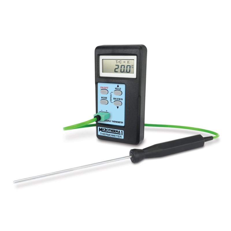 MicroTherma 1 has the versatility of accepting any type K, J, T, R, N, S or E thermocouple probe, the probe type is simply selected through the mode button. The unit incorporates both max and min readings with a reset function and also features an auto-power off facility that maximises the battery life, turning the instrument off automatically after 30 minutes, this function can be disabled if not required.