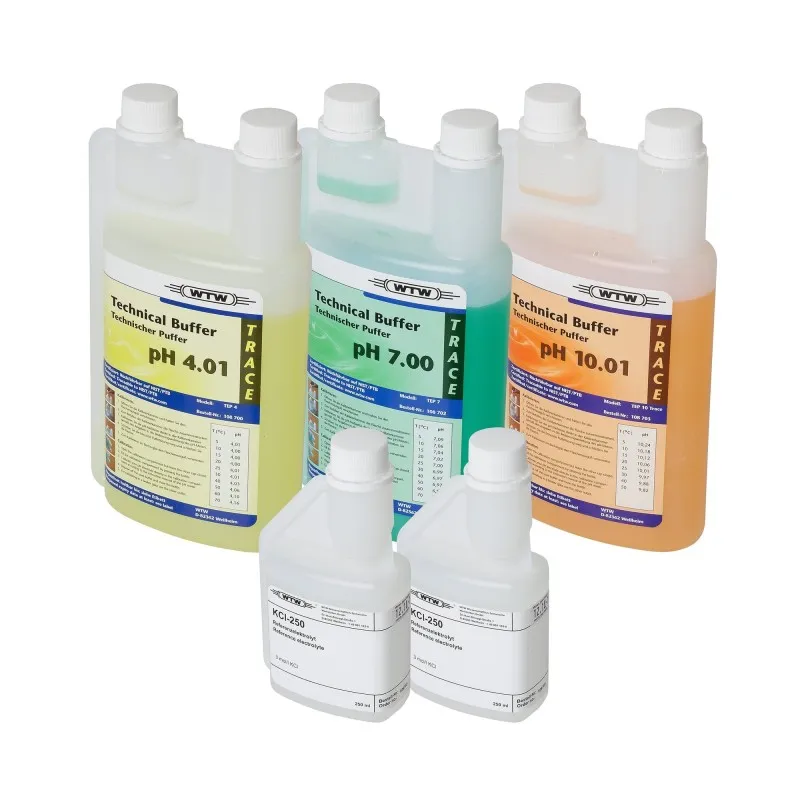 The Xylem WTW-109415 is a calibration and maintenance solution set. This set includes three 250ml bottles (pH 4.01, 6.87, 9.18) buffer solutions, pepsin cleaning solution and KCl filling solution 3mol/l.